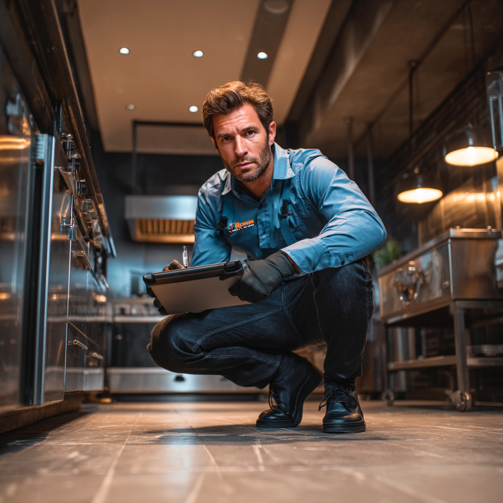 Professional pest control technician from Ronin Pest Control standing in a modern restaurant kitchen in Los Angeles